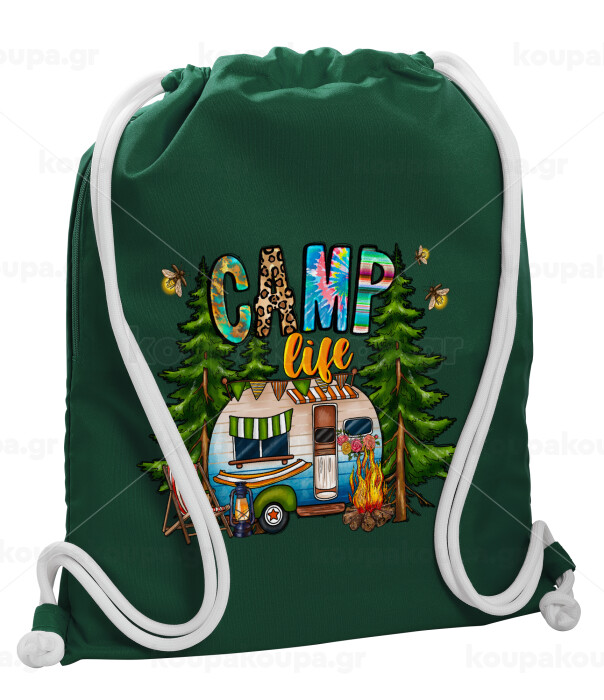 Camp Life, Backpack pouch GYMBAG BOTTLE GREEN, with pocket (40x48cm) & thick white cords