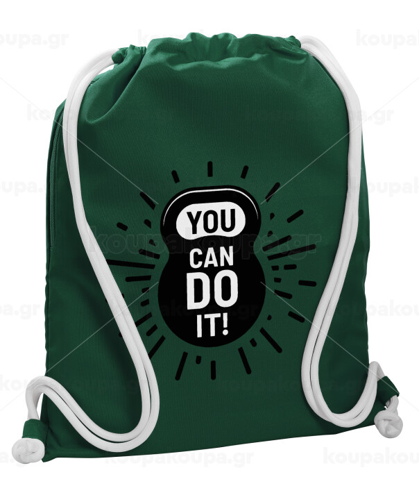 You can do it, Backpack pouch GYMBAG BOTTLE GREEN, with pocket (40x48cm) & thick white cords