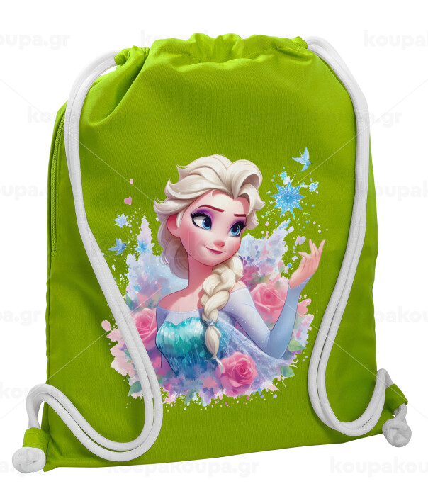 Elsa Princess, Backpack bag GYMBAG LIME GREEN, with pocket (40x48cm) & thick cords