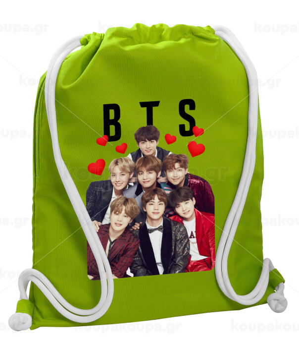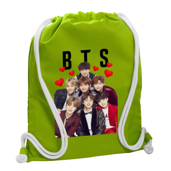 BTS hearts, Backpack bag GYMBAG LIME GREEN, with pocket (40x48cm) & thick cords