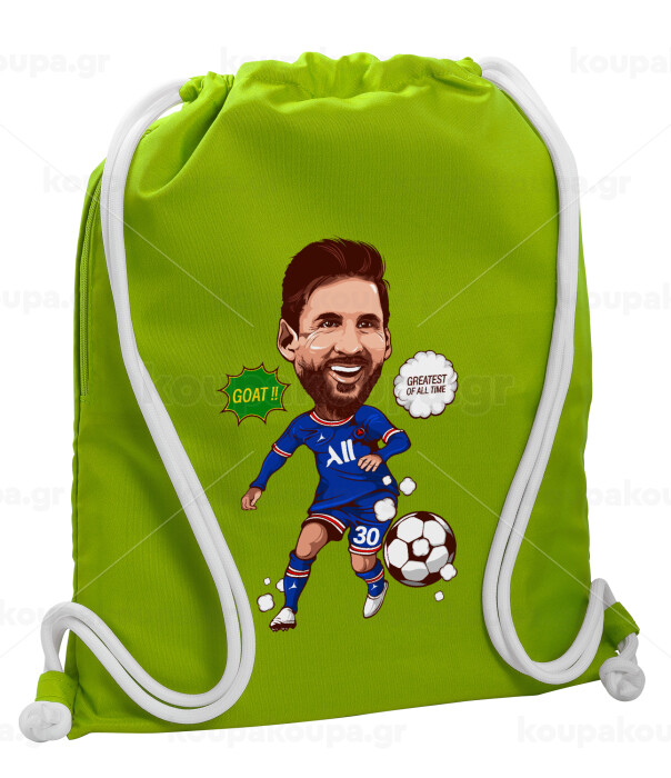Lionel Messi drawing, Backpack bag GYMBAG LIME GREEN, with pocket (40x48cm) & thick cords
