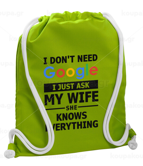 I don't need Google, just ask my WIFE, Backpack bag GYMBAG LIME GREEN, with pocket (40x48cm) & thick cords