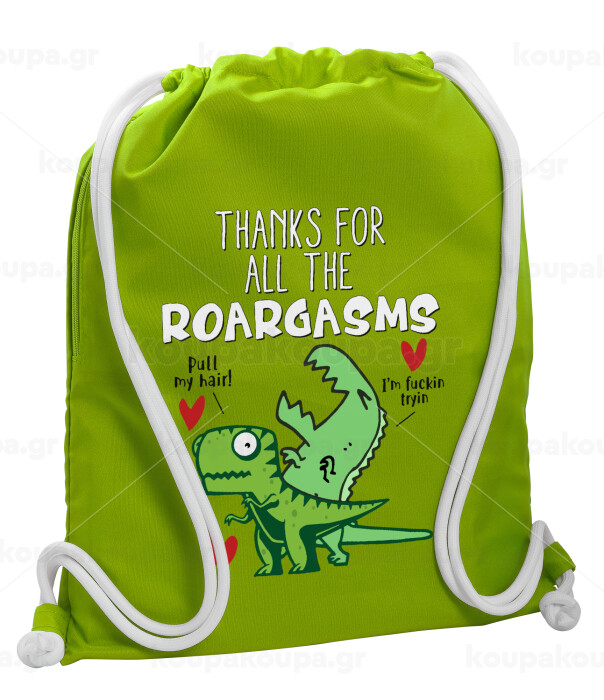 Thanks for all the ROARGASMS, Backpack bag GYMBAG LIME GREEN, with pocket (40x48cm) & thick cords