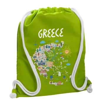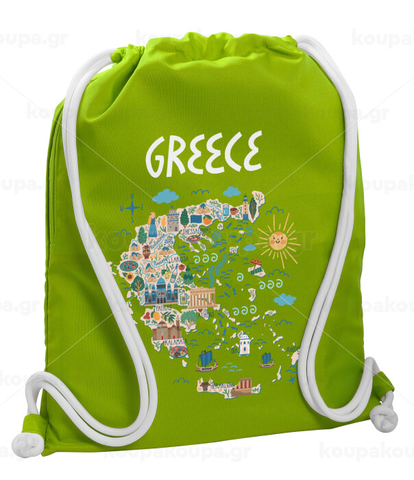 Greek map, Backpack bag GYMBAG LIME GREEN, with pocket (40x48cm) & thick cords
