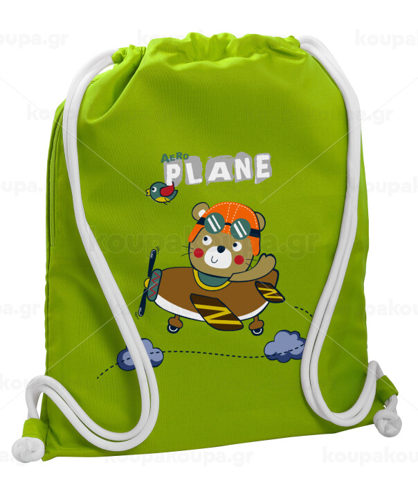Kids Plane, Backpack bag GYMBAG LIME GREEN, with pocket (40x48cm) & thick cords