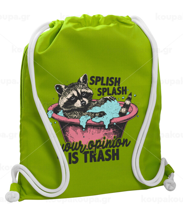 Splish splash your opinion is trash, Backpack bag GYMBAG LIME GREEN, with pocket (40x48cm) & thick cords