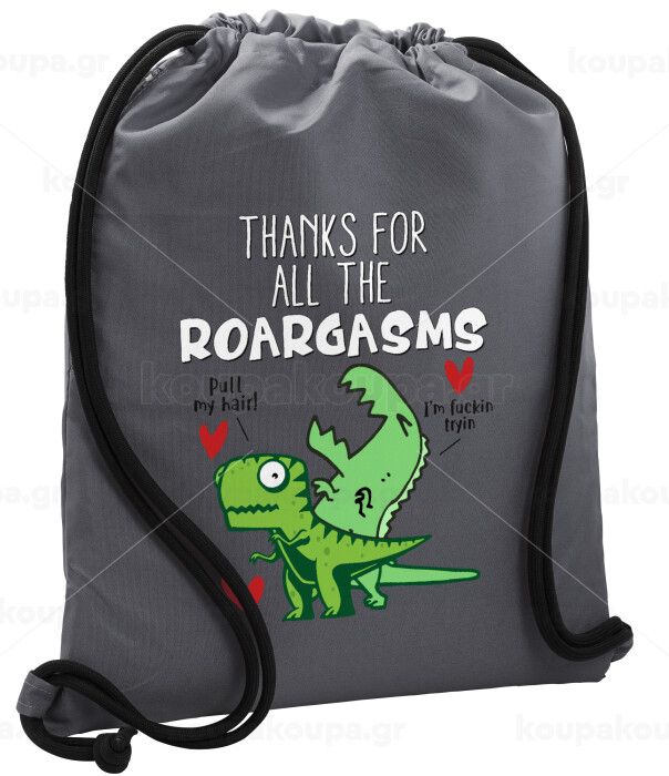 Thanks for all the ROARGASMS, Backpack pouch GYMBAG GREY, with pocket (40x48cm) & thick cords
