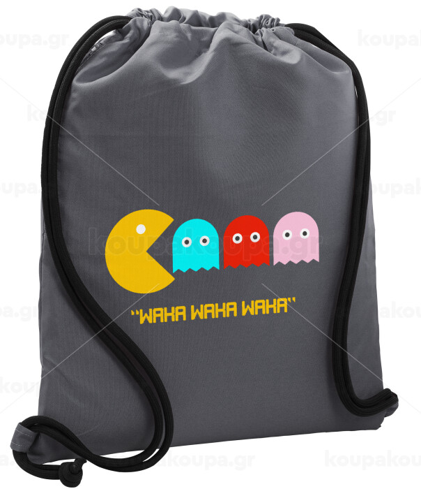 Pacman waka waka waka, Backpack pouch GYMBAG GREY, with pocket (40x48cm) & thick cords