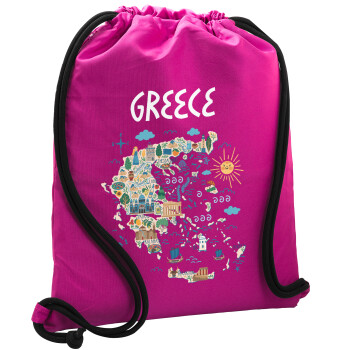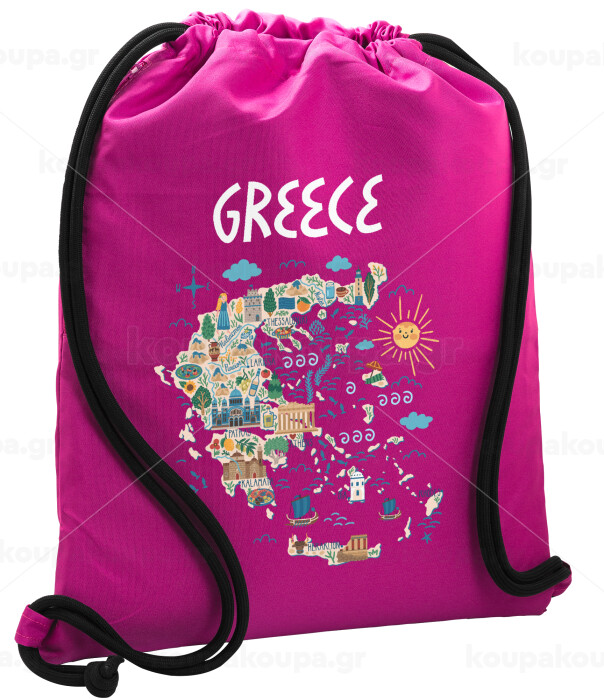 Greek map, Backpack pouch GYMBAG Fuchsia, with pocket (40x48cm) & thick cords