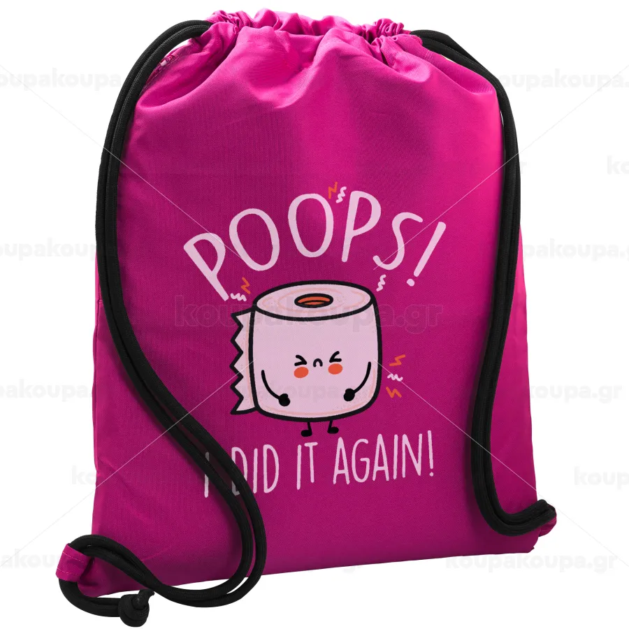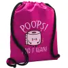 Poops!...I Did It Again, Backpack pouch GYMBAG Fuchsia, with pocket (40x48cm) & thick cords