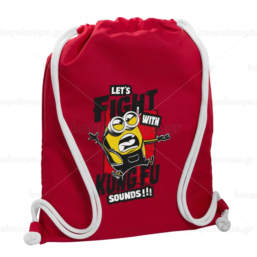 Minions Let's fight with kung fu sounds, Backpack pouch GYMBAG Red, with pocket (40x48cm) & thick cords