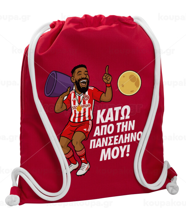 Ροντινέι, "ΚΑΤΩ ΑΠΟ ΤΗΝ ΠΑΝΣΕΛΗΝΟ ΜΟΥ!", Backpack pouch GYMBAG Red, with pocket (40x48cm) & thick cords