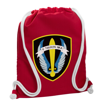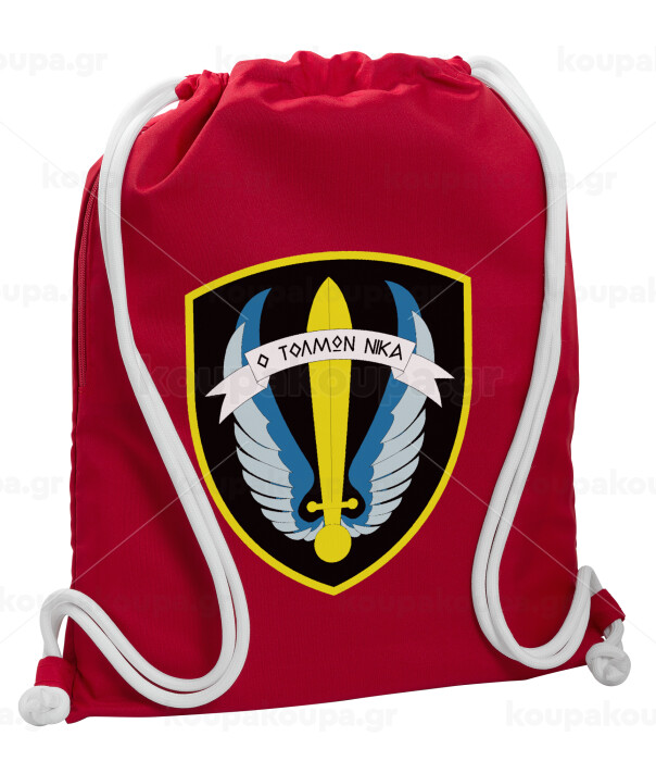 Έμβλημα Μονάδων Καταδρομών Ο Τολμων Νικα - Λοκ, Backpack pouch GYMBAG Red, with pocket (40x48cm) & thick cords