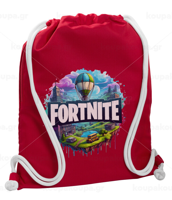 Fortnite land, Backpack pouch GYMBAG Red, with pocket (40x48cm) & thick cords