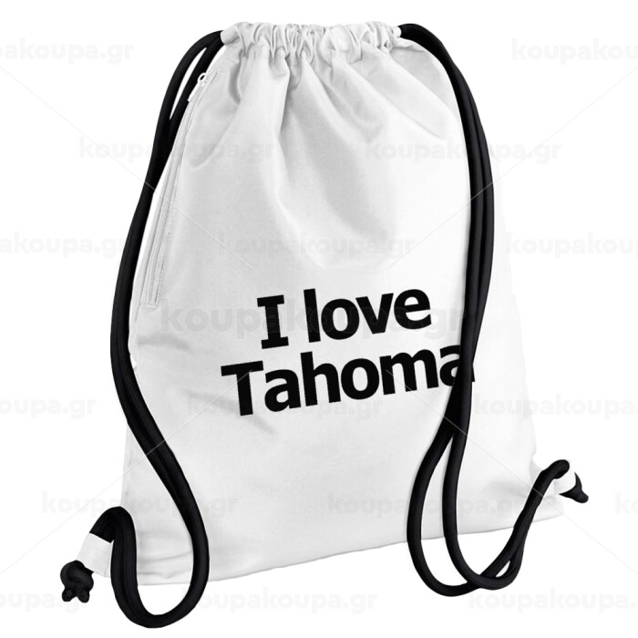 I love Tahoma, Backpack pouch GYMBAG white, with pocket (40x48cm) & thick cords