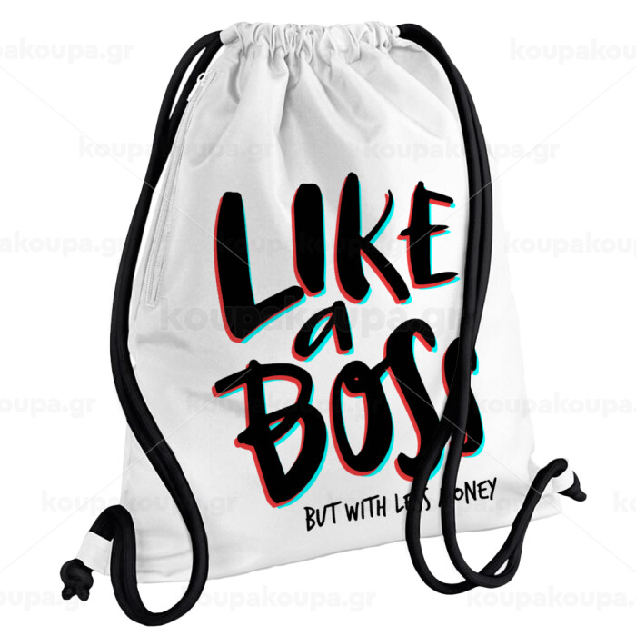 Like a boss, but with less money!!!, Backpack pouch GYMBAG white, with pocket (40x48cm) & thick cords
