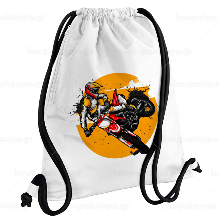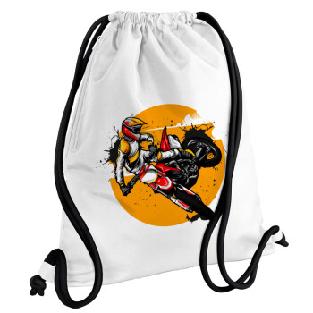 Motocross, Backpack pouch GYMBAG white, with pocket (40x48cm) & thick cords