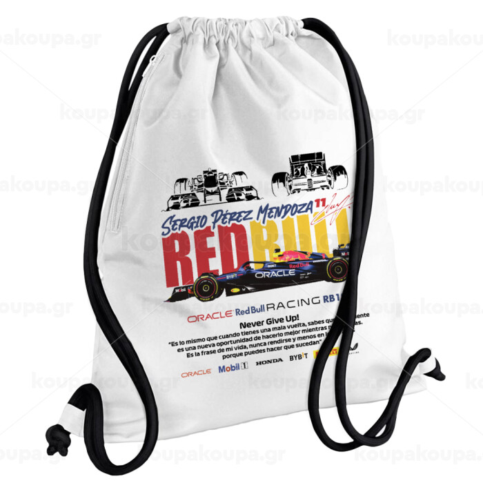 Sergio Perez - F1 Red Bull Racing, Backpack pouch GYMBAG white, with pocket (40x48cm) & thick cords