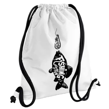 Fishing is fun, Backpack pouch GYMBAG white, with pocket (40x48cm) & thick cords