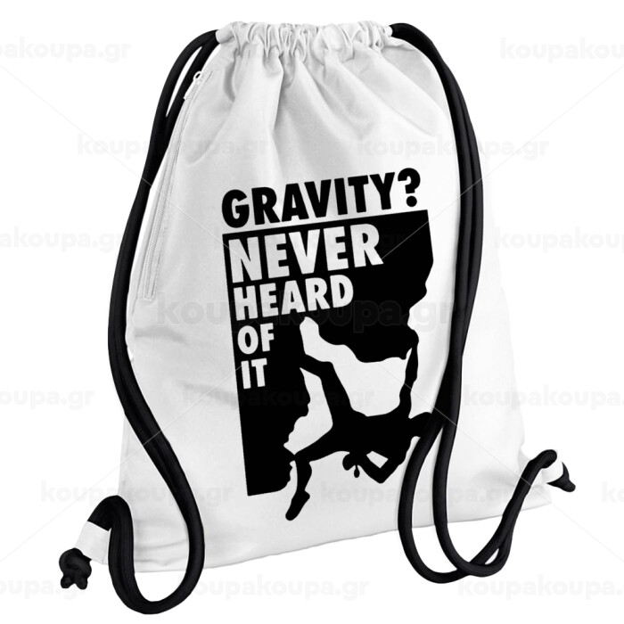 Gravity? Never heard of that!, Backpack pouch GYMBAG white, with pocket (40x48cm) & thick cords