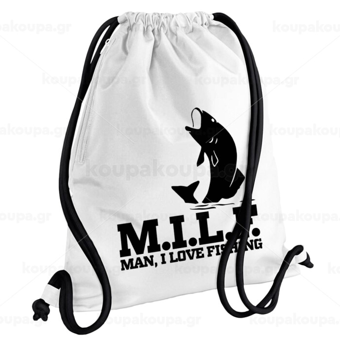 M.I.L.F. Mam i love fishing, Backpack pouch GYMBAG white, with pocket (40x48cm) & thick cords