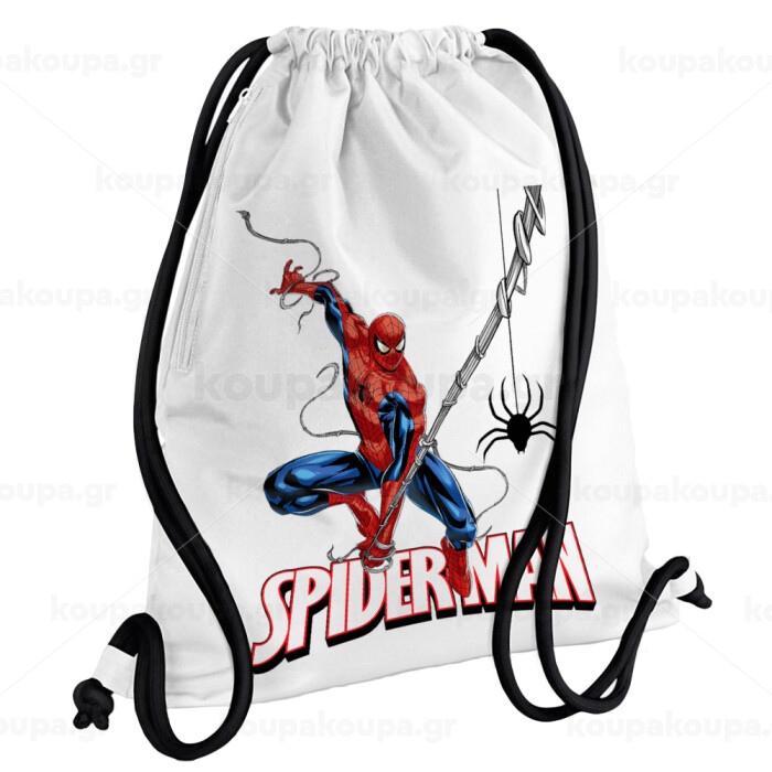 Spiderman fly, Backpack pouch GYMBAG white, with pocket (40x48cm) & thick cords