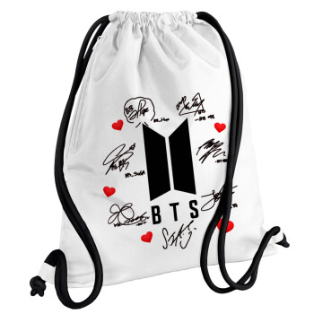 BTS signs, Backpack pouch GYMBAG white, with pocket (40x48cm) & thick cords