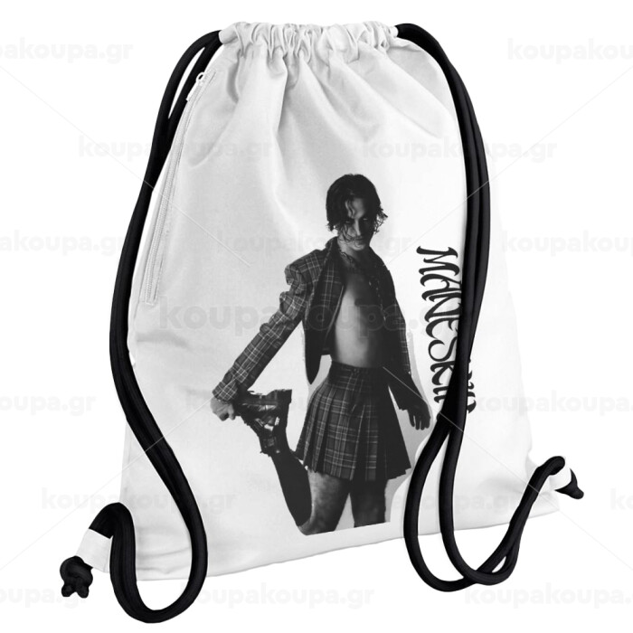 Maneskin Damiano David, Backpack pouch GYMBAG white, with pocket (40x48cm) & thick cords