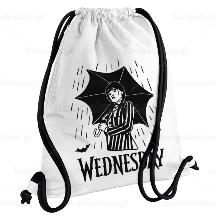 Wednesday Addams, Backpack pouch GYMBAG white, with pocket (40x48cm) & thick cords