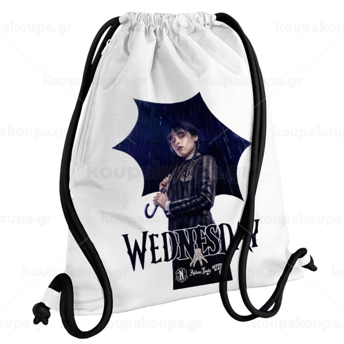 Wednesday rain, Backpack pouch GYMBAG white, with pocket (40x48cm) & thick cords