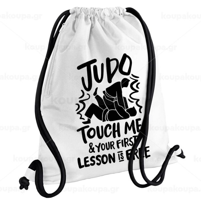 Judo Touch Me And Your First Lesson Is Free, Backpack pouch GYMBAG white, with pocket (40x48cm) & thick cords