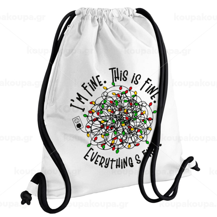 It's Fine I'm Fine Everything Is Fine, Backpack pouch GYMBAG white, with pocket (40x48cm) & thick cords