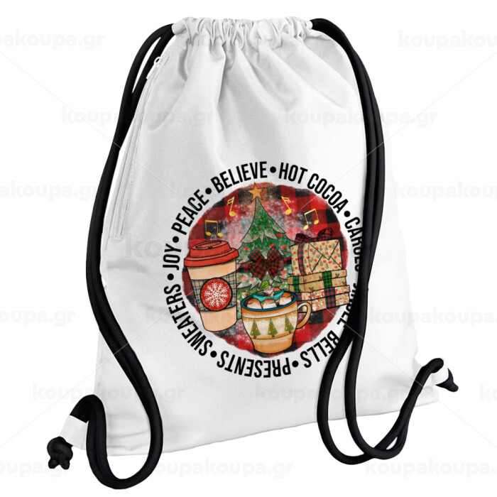 Joy, Peace, Believe, Hot Cocoa, Carols, Backpack pouch GYMBAG white, with pocket (40x48cm) & thick cords
