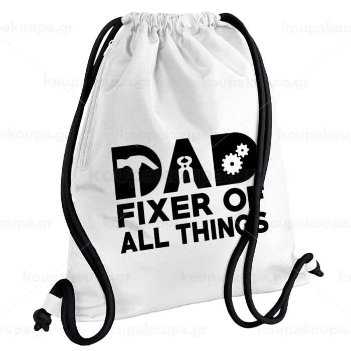 DAD, fixer of all thinks, Backpack pouch GYMBAG white, with pocket (40x48cm) & thick cords