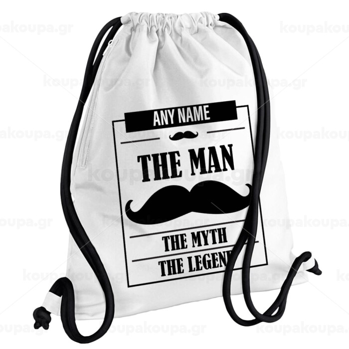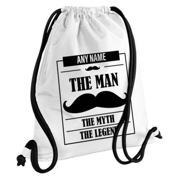 The man, the myth, Backpack pouch GYMBAG white, with pocket (40x48cm) & thick cords