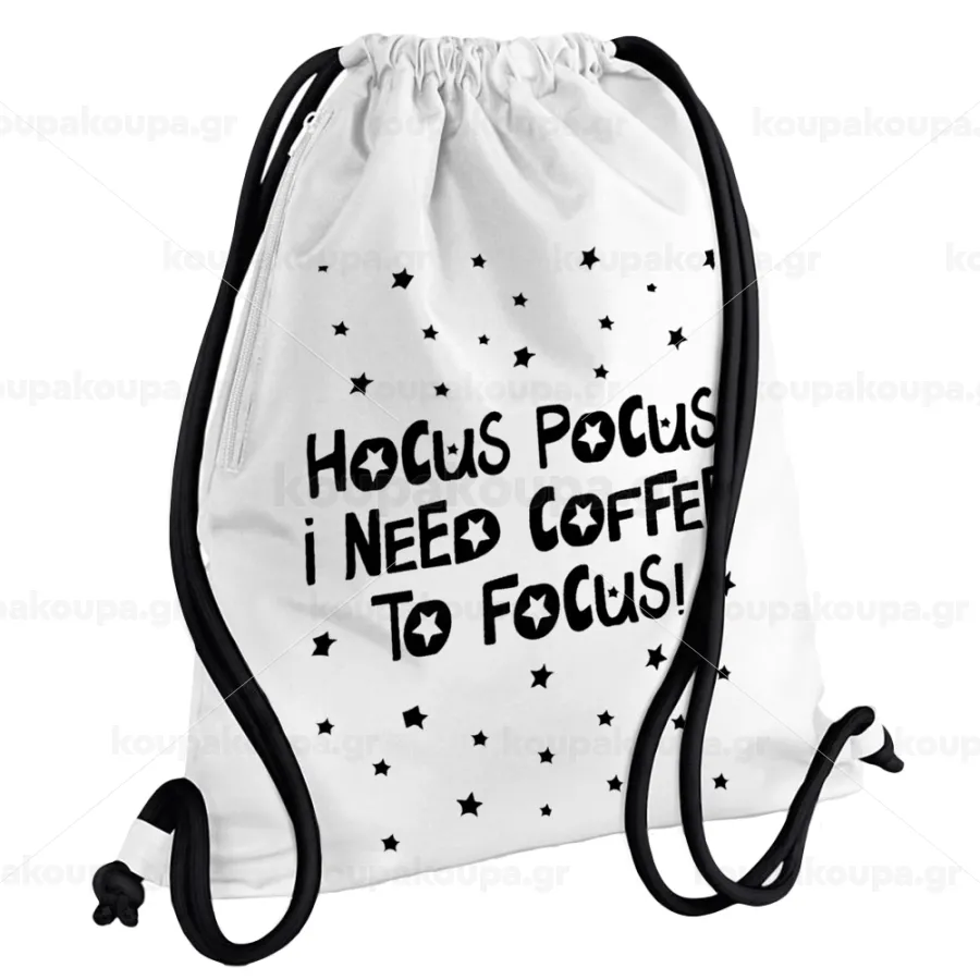 Hocus pocus i need coffee to focus - halloween, Backpack pouch GYMBAG white, with pocket (40x48cm) & thick cords
