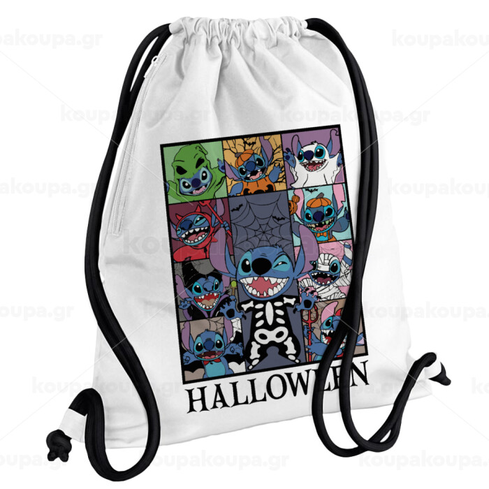 Stitch Halloween, Backpack pouch GYMBAG white, with pocket (40x48cm) & thick cords