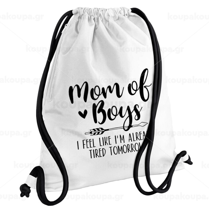 Mom of boys i feel like im already tired tomorrow, Backpack pouch GYMBAG white, with pocket (40x48cm) & thick cords