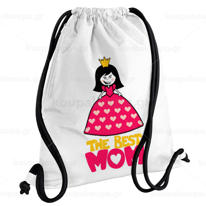 The Best Mom Queen, Backpack pouch GYMBAG white, with pocket (40x48cm) & thick cords