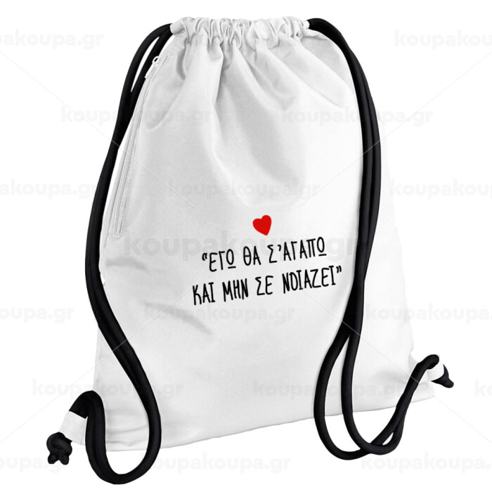 ΕΓΩ ΘΑ Σ’ΑΓΑΠΩ ΚΑΙ ΜΗΝ ΣΕ ΝΟΙΑΖΕΙ..., Backpack pouch GYMBAG white, with pocket (40x48cm) & thick cords
