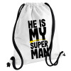 He is my superman, Backpack pouch GYMBAG white, with pocket (40x48cm) & thick cords