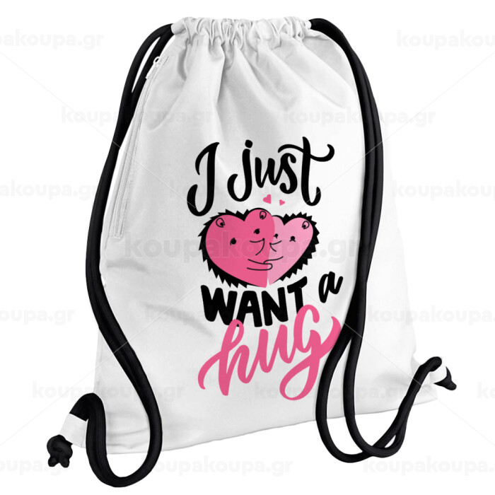 I Just want a hug!, Backpack pouch GYMBAG white, with pocket (40x48cm) & thick cords