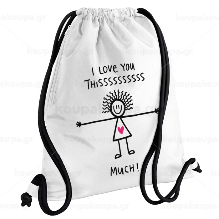 I Love you thissss much..., Backpack pouch GYMBAG white, with pocket (40x48cm) & thick cords