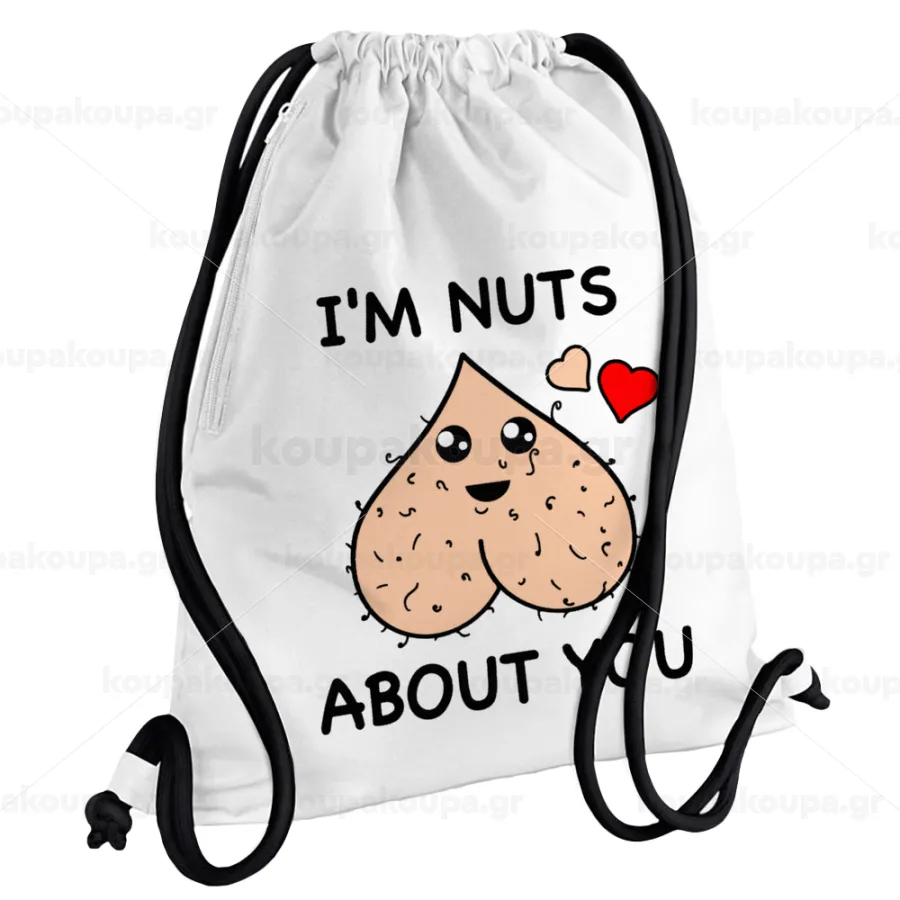 I'm Nuts About You, Backpack pouch GYMBAG white, with pocket (40x48cm) & thick cords