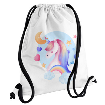 Cute unicorn, Backpack pouch GYMBAG white, with pocket (40x48cm) & thick cords