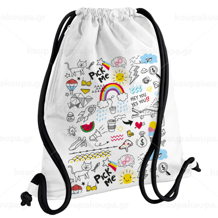 Doodle kids, Backpack pouch GYMBAG white, with pocket (40x48cm) & thick cords