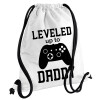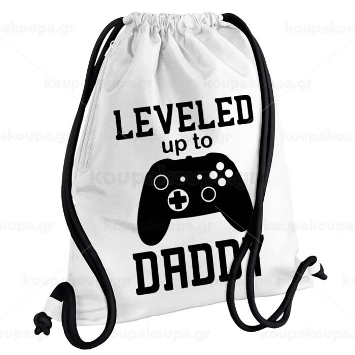 Leveled to Daddy, Backpack pouch GYMBAG white, with pocket (40x48cm) & thick cords