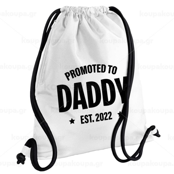 Promoted to Daddy, Backpack pouch GYMBAG white, with pocket (40x48cm) & thick cords