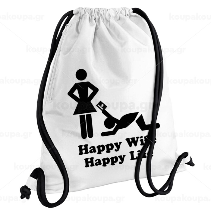 Happy Wife, Happy Life, Backpack pouch GYMBAG white, with pocket (40x48cm) & thick cords