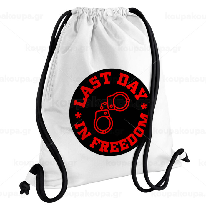 Last day in freedom, Backpack pouch GYMBAG white, with pocket (40x48cm) & thick cords